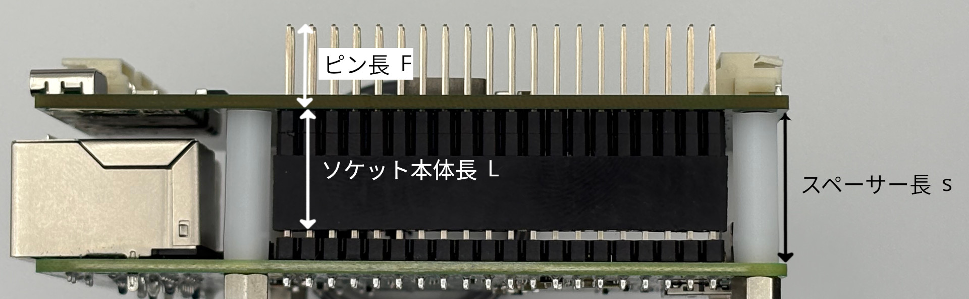 取り付けたい基板裏面の部品高 A と RaspberryPi に接続している一番上の基板表面の部品高 B の合計の高さから連結コネクタのソケットの長さ L と スペーサーの長さ s を決定する