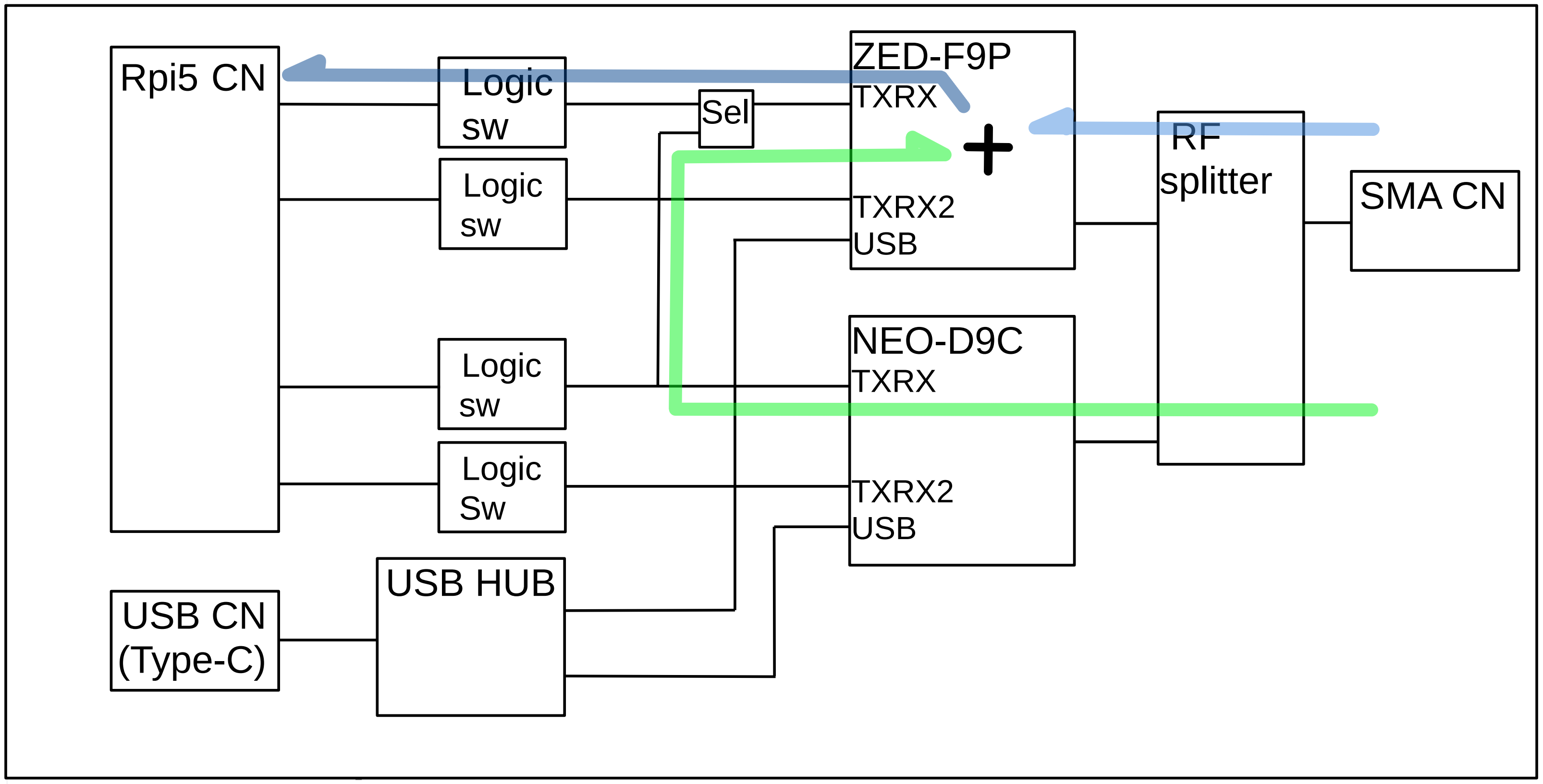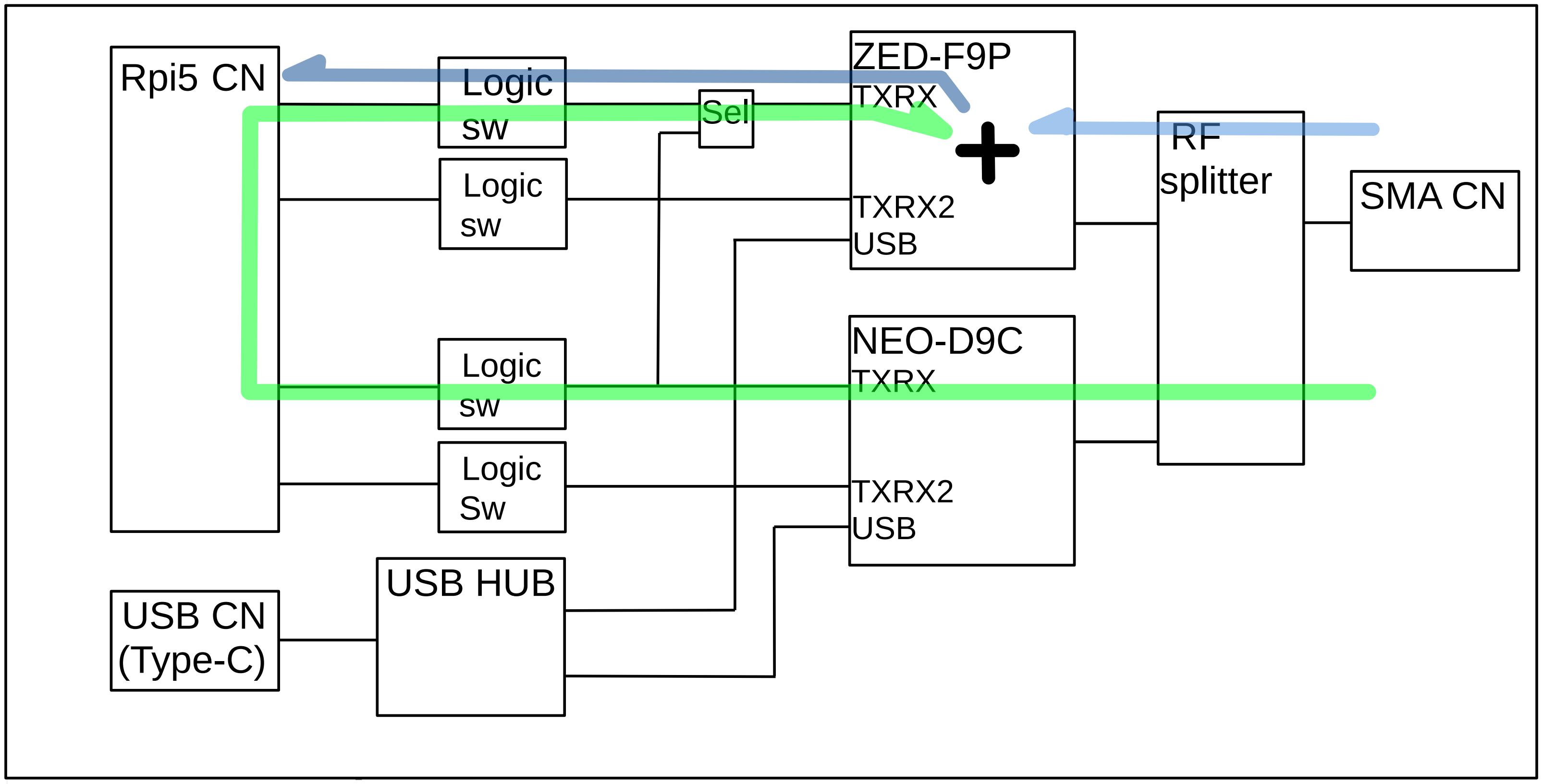 補正情報の転送で 1-1 は Ubuntu 上で転送しているが, ソフトウェアを介さず図上の Sel (基板上の JP1) の切り換えだけで可能です. 現在 JP1 は 1-2 が接続されています. この 1-2 の配線を切り 2-3 をはんだで接続する事により, 基板上で補正データが転送できます. この際 UART0 から ZED-F9P に送られるデータは無視される事になります.