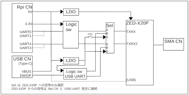 基板上のチップ抵抗の接続変更により USB Type-C コネクタの接続を USB-UART でなく ZED-X20P に直接接続でき通信ができます. 但し, 正式サポートされているものではなく, USB からのファームアップデートはできませんので, デフォルトの接続での使用をお進めします.