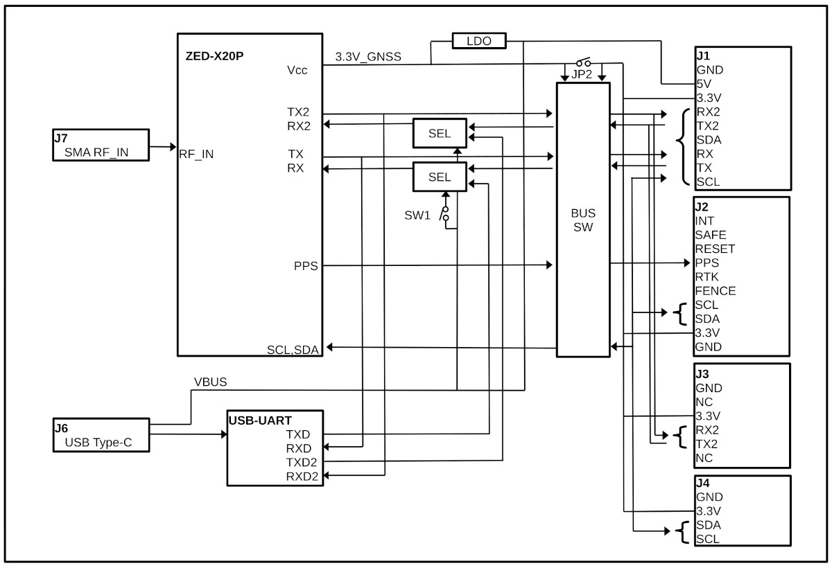 ZED-X20P の USB 通信は正式にはサポートしていませんが通信は可能です. ただし通信が正しく行なわれない場合があり, 本基板では別途 USB-UART を搭載し見掛け上 USB で設定を行なう様にしています. 通信が不安定であっても ZED-X20P の USB で設定や GNSS 情報を行ないたい場合はチップ抵抗の付け替えで可能です.